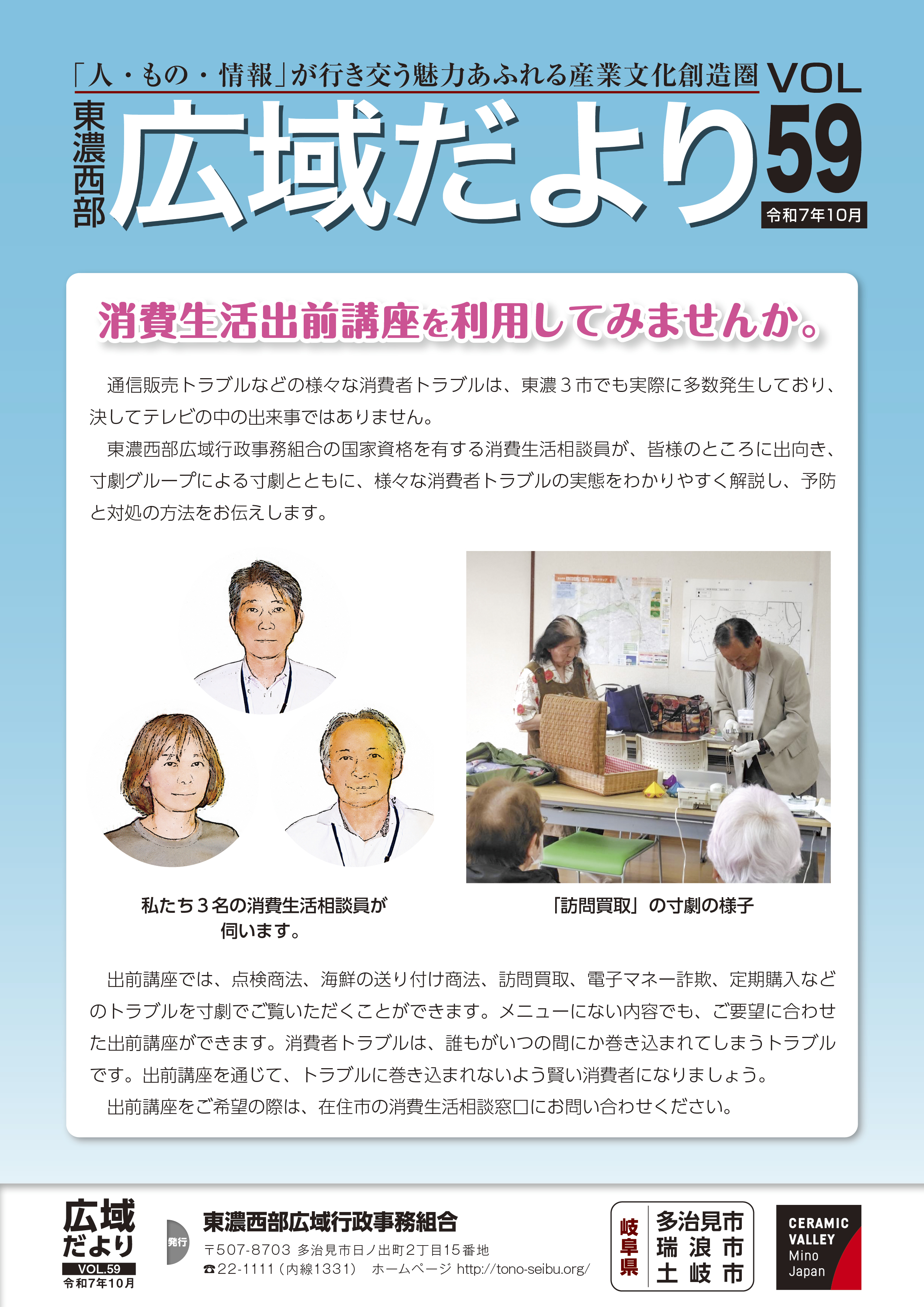表紙(消費生活相談事業) 2ページ(東濃地域医師確保奨学資金等奨学生の募集) 3ページ(狂犬病予防注射のご案内) 4ページ(消費生活相談事業) 一括ダウンロード |